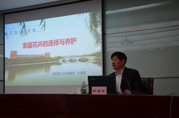 “雅室何须大,花香不在多。”为了帮助教职工们更科学地进行花卉种植与养护,提升生活品质,由校工会主办,英国365集团承办,特邀后勤集团物业中心园林绿化高级工程师杜绪明,于3月26日下午在明德楼方形会议室为大家做关于室内盆栽花卉养护技术讲座。