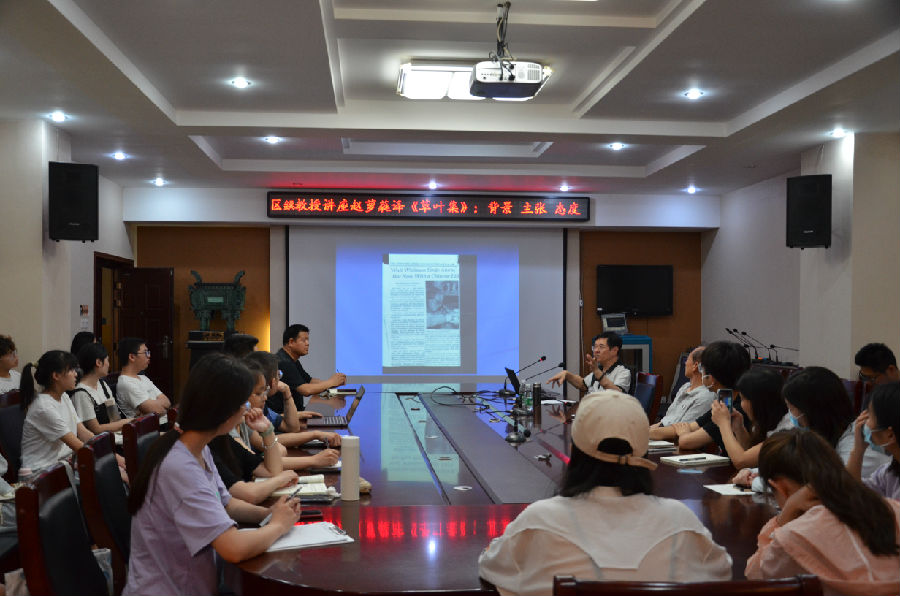 报告伊始,区鉷从《外国文学评论》中对赵萝蕤译惠特曼诗的评价出发,结合自己与赵萝蕤的信件往来,讲述了赵萝蕤译《草木集》的背景。随后,他结合自己的思考和感悟,总结了赵萝蕤翻译诗文时形神相似、忠实于原作、运用直译法以及无翻译不研究的主张,向在座师生介绍了赵萝蕤译《草木集》的版本考订、惠特曼的个性化表达方式、社会历史知识和导读等四类注释相关信息。最后,区鉷高度赞扬了赵萝蕤在面临“下海”诱惑时,坚定立场,坚持自己对翻译工作的严谨学术态度。他鼓励同学们向赵萝蕤先生学习,从事翻译工作时,一定要保持严谨的翻译态度和正确的翻译主张。