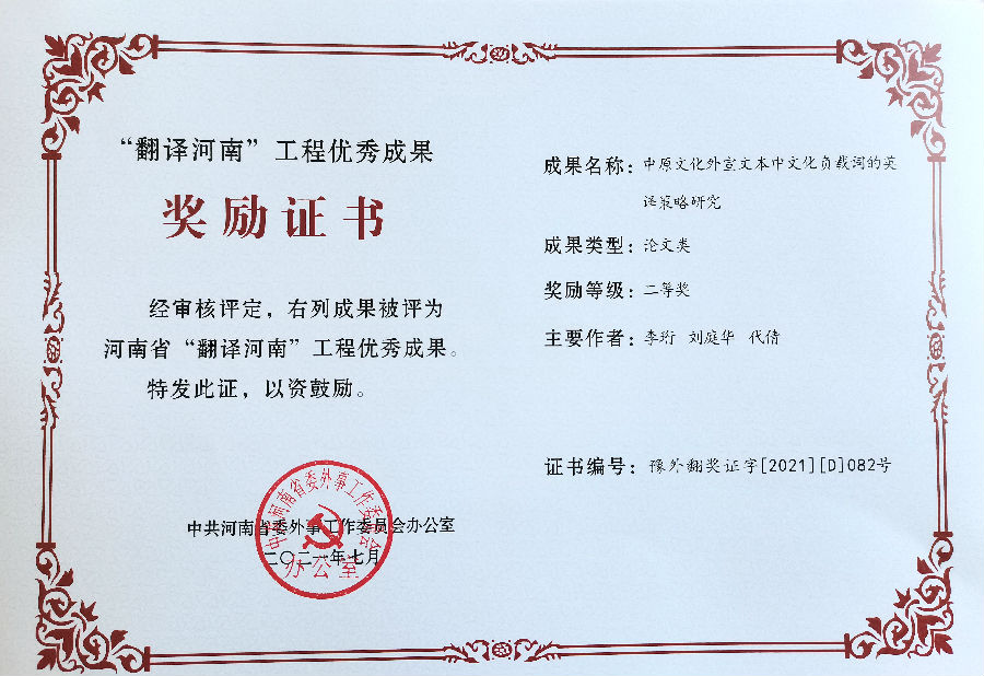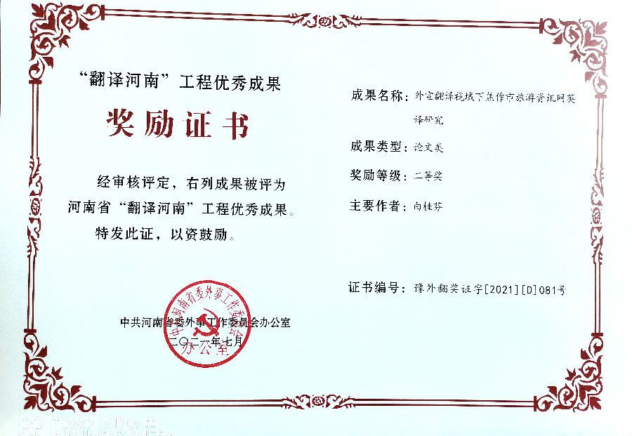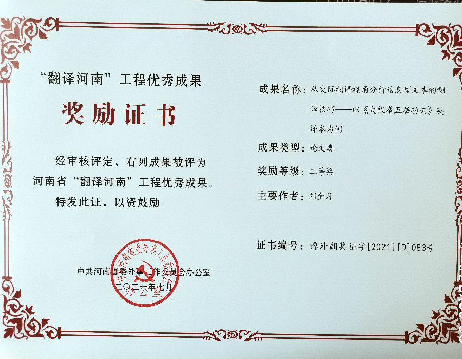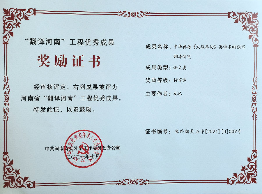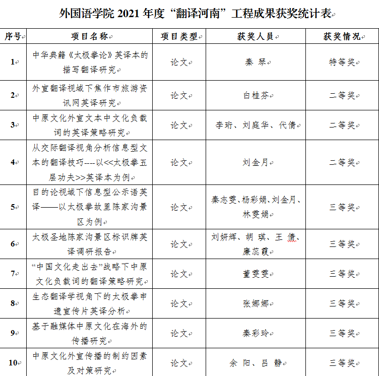近日,收到《关于“翻译河南”工程优秀成果奖评选结果的通报》(豫外委办〔2021〕33号),公司师生共申报10项成果,全部榜上有名。其中,秦琴老师撰写的《中华典籍《太极拳论》英译本的描写翻译研究》获得论文类特等奖;二等奖3项,三等奖6项。