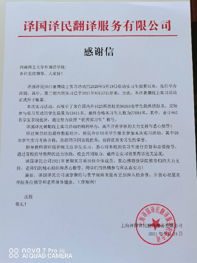 据悉,译国译民公司是中国翻泽协会理事单位、全球语言服务商百强、全国翻译专业学位研究生教育实习基地,旗下拥有译国译民翻译、译国译民教育、言之友悟等核心子品牌。
