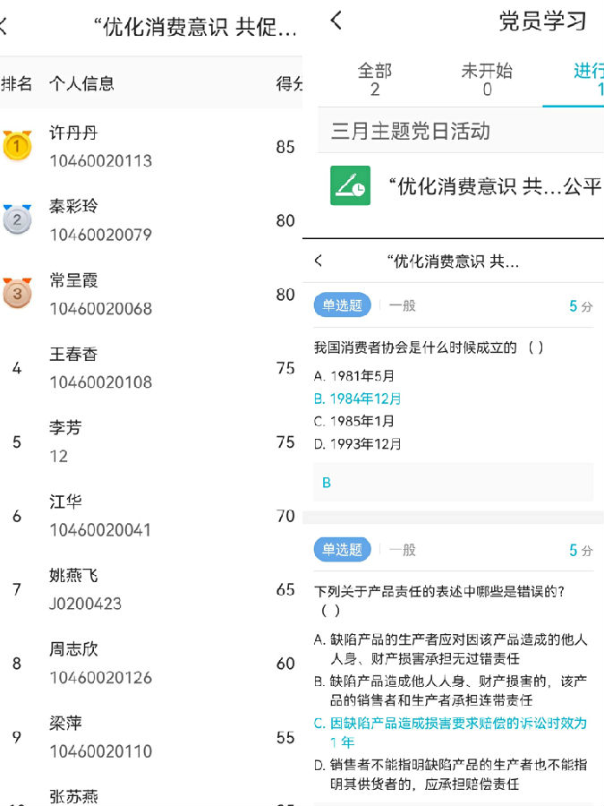 支部全体党员展开了一场激烈的消费者权益知识竞赛。由于疫情等原因,竞赛采取了线上限时答题的形式。本次竞赛共设测试题目20题,每题5分,满分总计100分,题目均为单项选择,限时30分钟内完成,得分高,用时少的者获胜。该党支部的党员同志。积极参与。通过竞赛,有的党员表现出知识储备量大,知识面广,答题又快又准;有的党员稳扎稳打,有条不紊的思考着答题;也有一些党员反映确实对消费者权益相关知识了解有限,答题吃力;有的党员把所有题目做过一遍之后,提出要求重新作答一次,以便更好地温习题目内容。