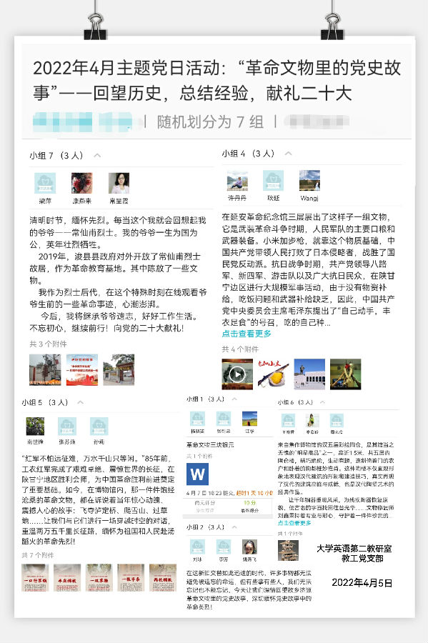 为进一步激发党员学习党史的兴趣,巩固党员党史学习教育的成果,大学英语第二教研室教工党支部于2022年4月5日,举办了以“革命文物里的党史故事”为主题的党日活动。结合疫情防控要求,避免人员聚集,本次活动采取线上活动形式。