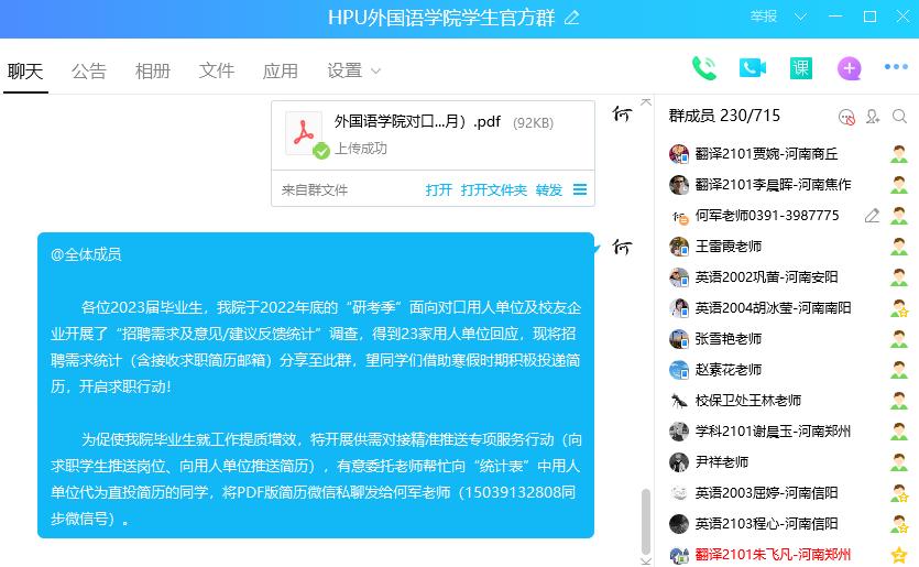 该院贯彻落实全国、全省普通高校毕业生就业创业工作网络视频会议精神,积极主动地向市场向社会拓展岗位,多种方式拓宽就业岗位信息来源,主动联系用人单位和员工企业,依托“问卷星”平台开展2022年“研考季”用人单位招聘需求及意见/建议反馈统计,得到23家用人单位回应,征集到就业岗位481个。元旦后,该院全面启动校企供需对接精准推送专项服务行动,将有招聘需求的用人单位名录推送给应往届待求职毕业生,员工工作教师帮助求职员工向用人单位招聘人员线上直投简历,以品质就业服务为目标,确保毕业生就业工作持续向好。据悉,该院将以获准立项的《基于高校院(系)的“引‘企’入群”式精准就业服务平台建设》2023年度思想政治工作服务育人项目为契机,坚持就业育人导向,不断提升人才培养与社会需求的契合度和贡献度,切实提升就业指导服务质量。